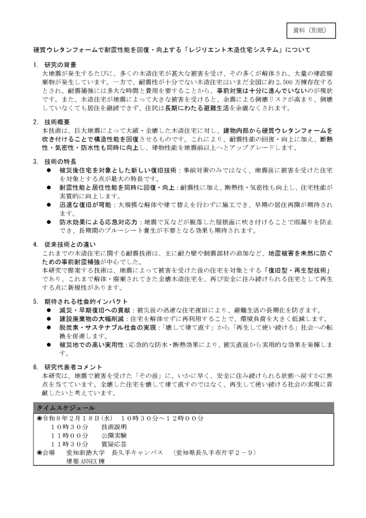 大地震で「大破・全壊」した木造住宅を再生巨大地震を想定した「レジリエント木造住宅システム」技術説明会および公開実験の開催について