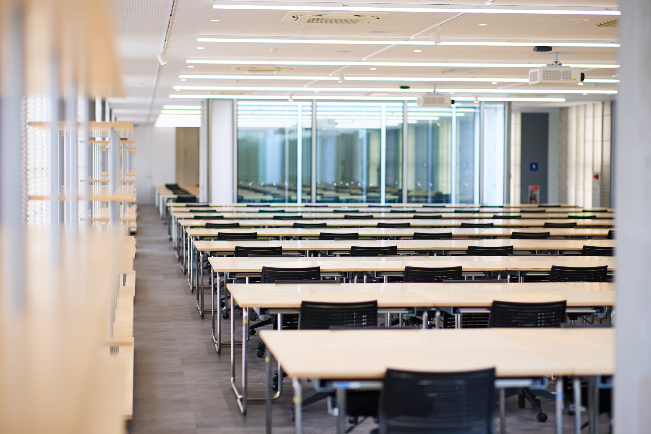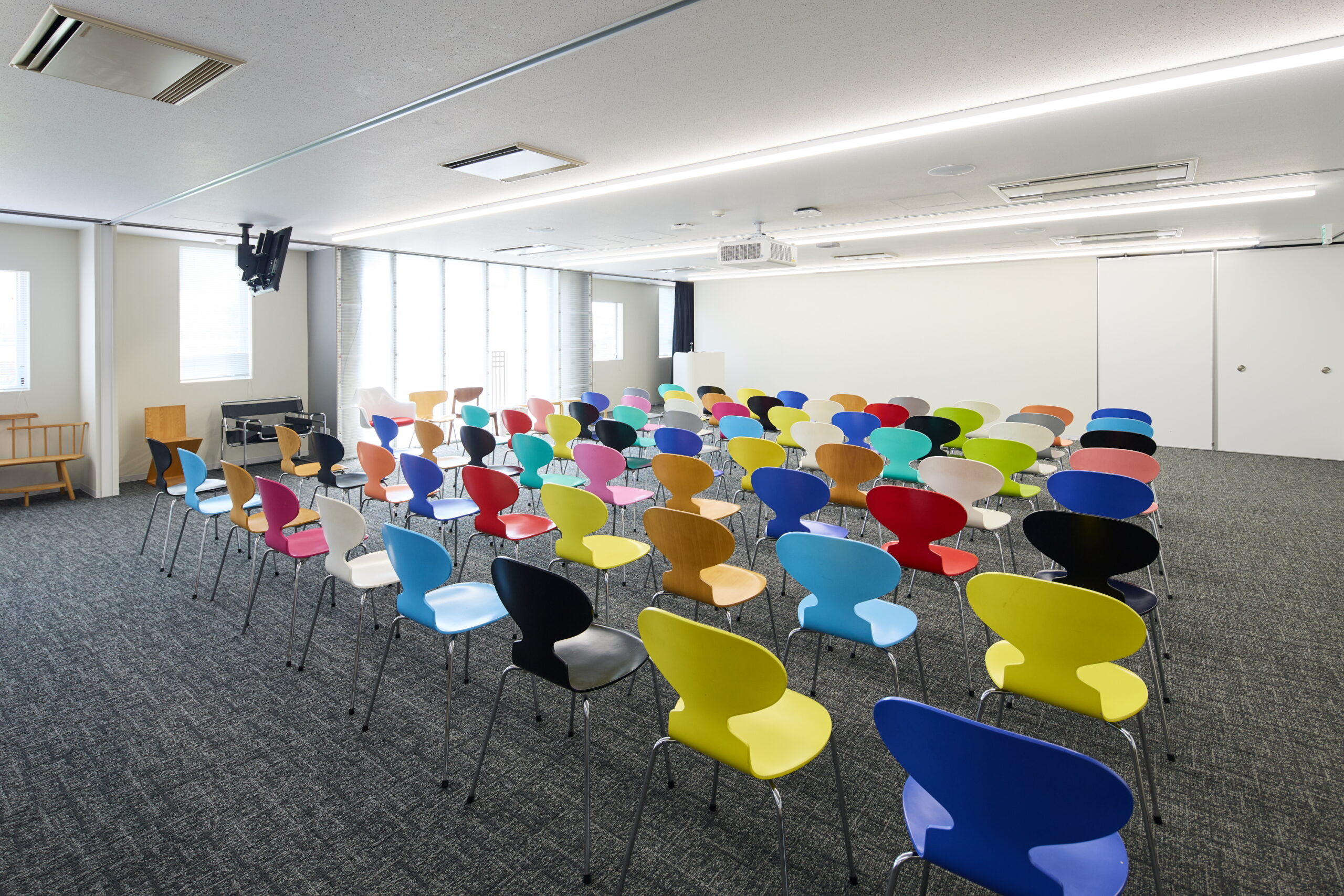 設計課題や卒業設計、論文の発表や講評会などに使用される多目的な発表空間です。カラフルな椅子が並ぶ明るい室内には、プロジェクターや音響設備も備えられており、活発なディスカッションを通してプレゼンテーションの技術を学びます。