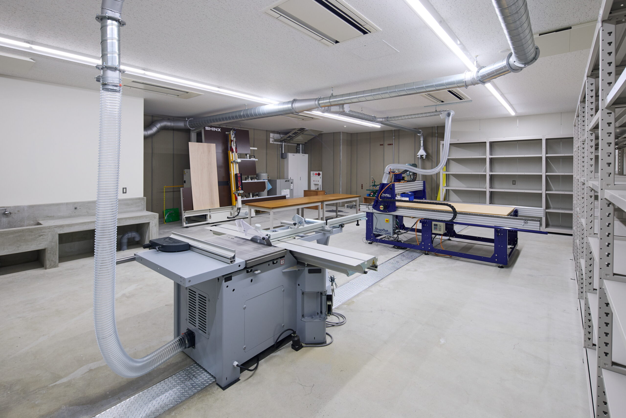 家具や木工製品などの製作を行うために整備された工房空間です。この工房は、建築空間サイズの作品から、日常で使われるようなテーブルや椅子といった家具サイズの作品まで、多様なスケールのものづくりに対応できる十分な広さがあります。
